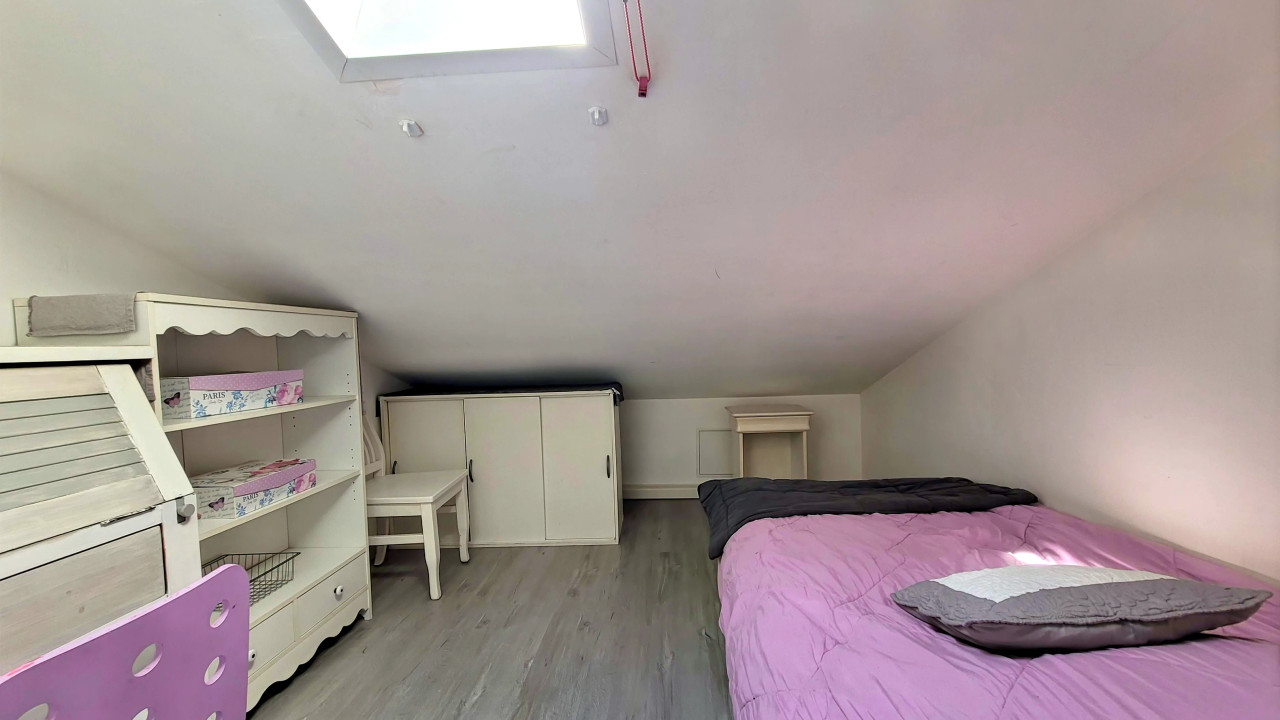 Upstairs, three attic-style bedrooms and a shower room with WC provide a functional sleeping area, ideal for children, guests or grandkids.
