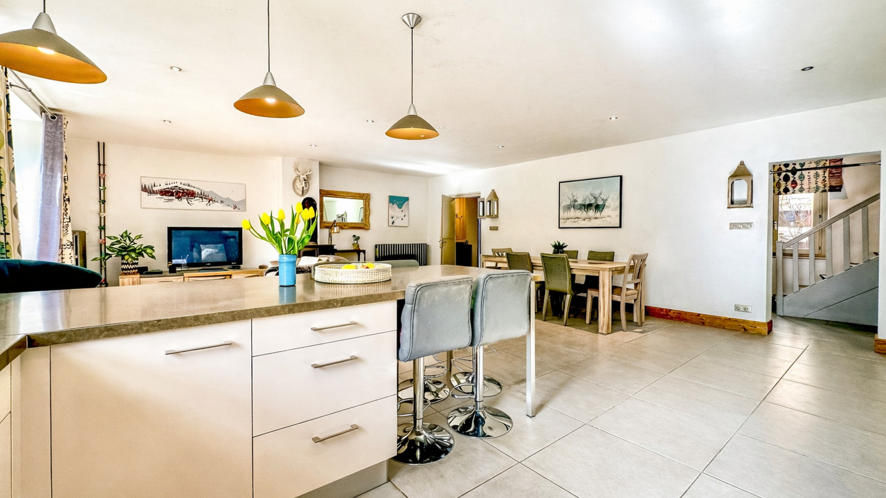 The main house features an entrance cloakroom leading into a spacious 53m² open-plan living area, combining dining and sitting spaces with a fully equipped kitchen offering ample storage. The sitting area leads to a south-east facing terrace and an additional south-facing garden, ensuring plenty of natural light and beautiful views of the garden and surrounding mountains. A WC and separate laundry room are accessed from the hallway, along with stairs leading to the first floor.