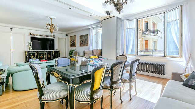 A39618AAD75 - PARIS 16th – Dauphine/Foch – 3-room apt (T3) – Energy rating: D/D – 94m² (see floor plan) – Just steps from rue de Longchamp and the Bois de Boulogne, 650m from Porte Dauphine, located on the 1st floor of a secure 1930 building with elevator, this beautiful through-apartment (94m² Carrez) enjoys a southwest orientation, abundant natural light, courtyard views with no overlooking and an open outlook. The apartment comprises an entrance leading to a 29m² living room with bar area, a 20m² dining room that can be closed off to create an additional bedroom, a 17m² bedroom, a fully equipped separate kitchen, a shower room with WC, and a bathroom with WC. Flooded with light thanks to its wide windows, this home offers a rare haven of peace in a sought-after neighborhood of the capital. Equipped with air conditioning. The elegant 16th district, particularly rue de la Faisanderie, is renowned for its Haussmann buildings, quiet residential feel, and proximity to the Bois de Boulogne.