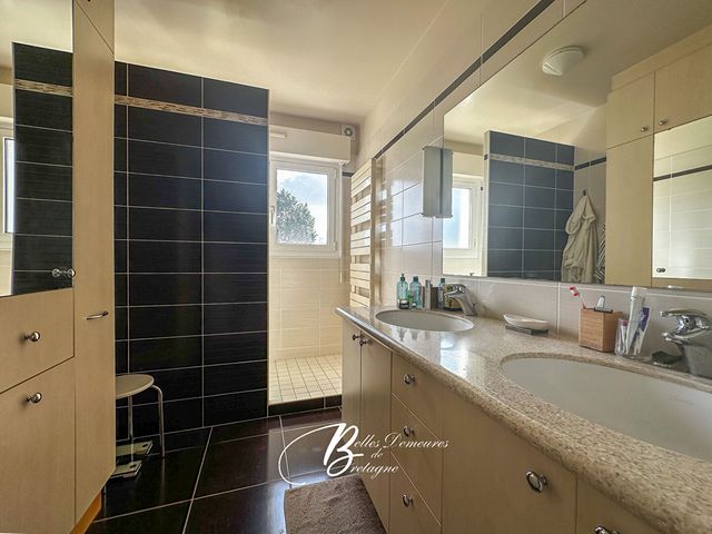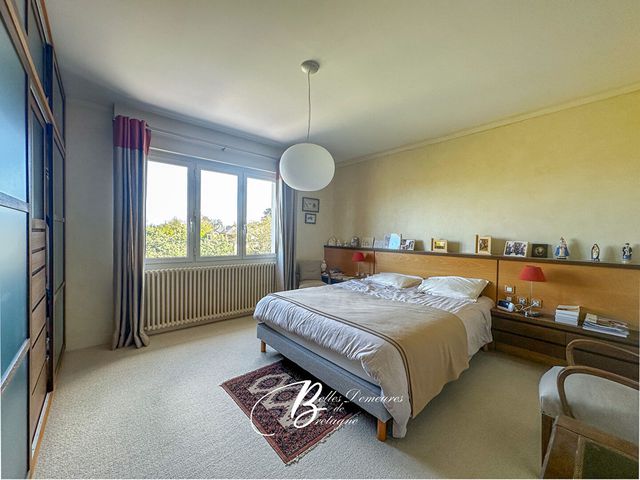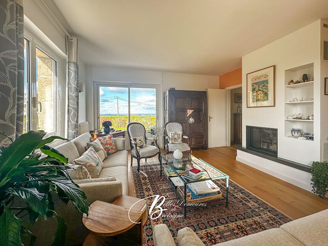 Dans la maison principale, les pièces s'articulent autour d'une vaste entrée. On passe ainsi du salon doté d'une cheminée avec insert à la salle à manger, puis à la cuisine aménagée. Les pièces de réception profitent d'une vue sur la baie de Paimpol ainsi que sur l'archipel de Bréhat et deux terrasses bénéficiant d'une exposition différente permettent de choisir où aller en fonction de l'heure. Au même niveau, on trouve des WC précédés d'un petit vestiaire et, bien séparé, un grand espace parental: chambre, salle de bain, lingerie ainsi qu'une autre petite pièce utilisable en dressing ou bureau.A l'étage, la coursive distribue quatre chambres, une salle de bain et des WC séparés. Vous apprécierez particulièrement la vue dégagée offerte par l'une de ces chambres.Le sous-sol intégral comporte deux caves, un espace de rangement, une pièce chauffée avec fenêtre, la buanderie-chaufferie et un garage.