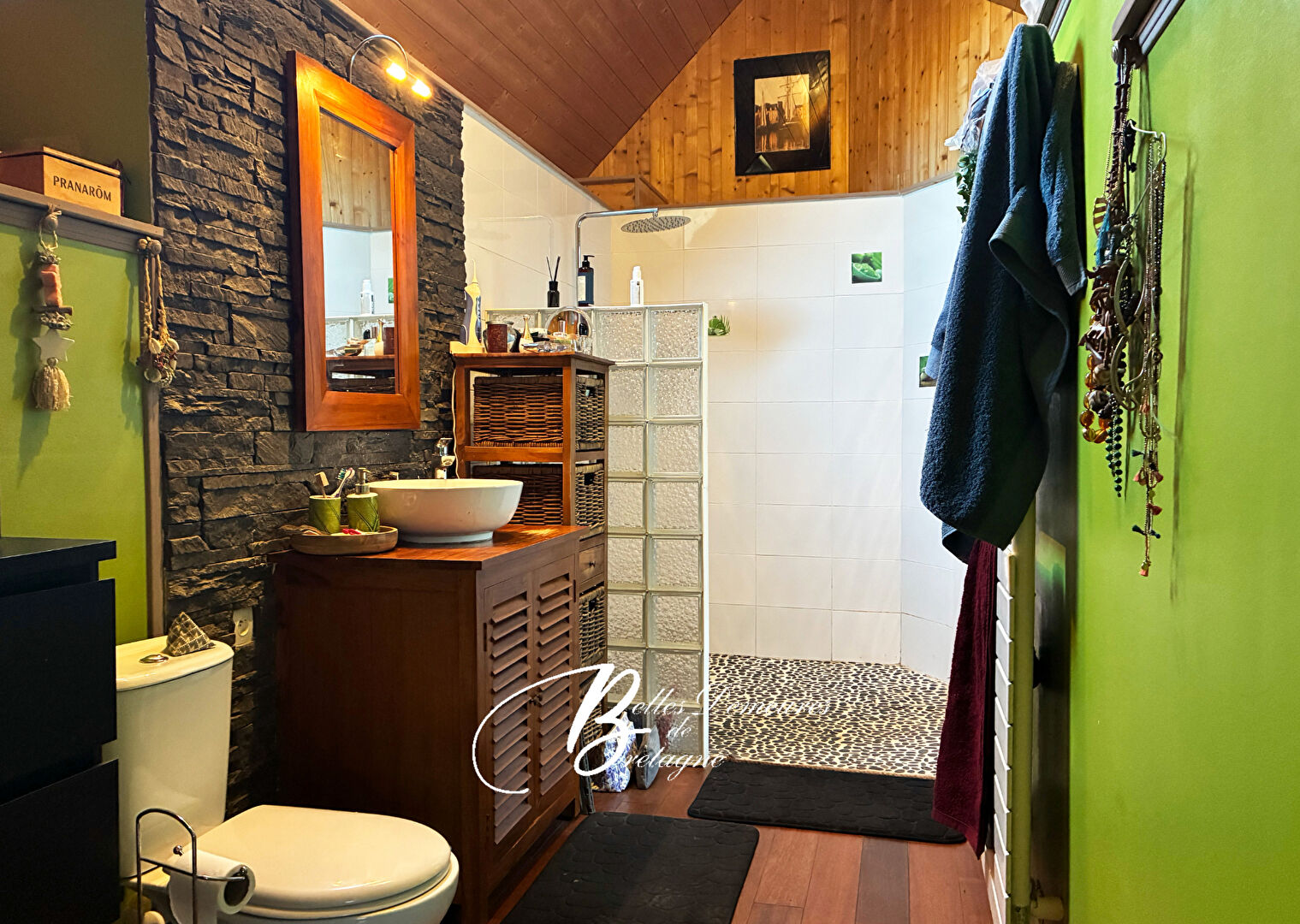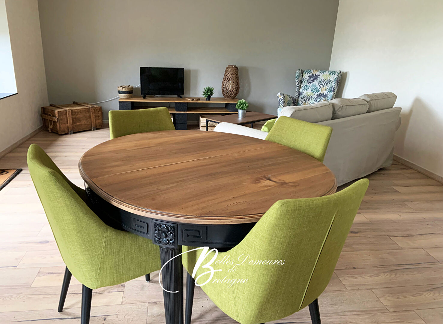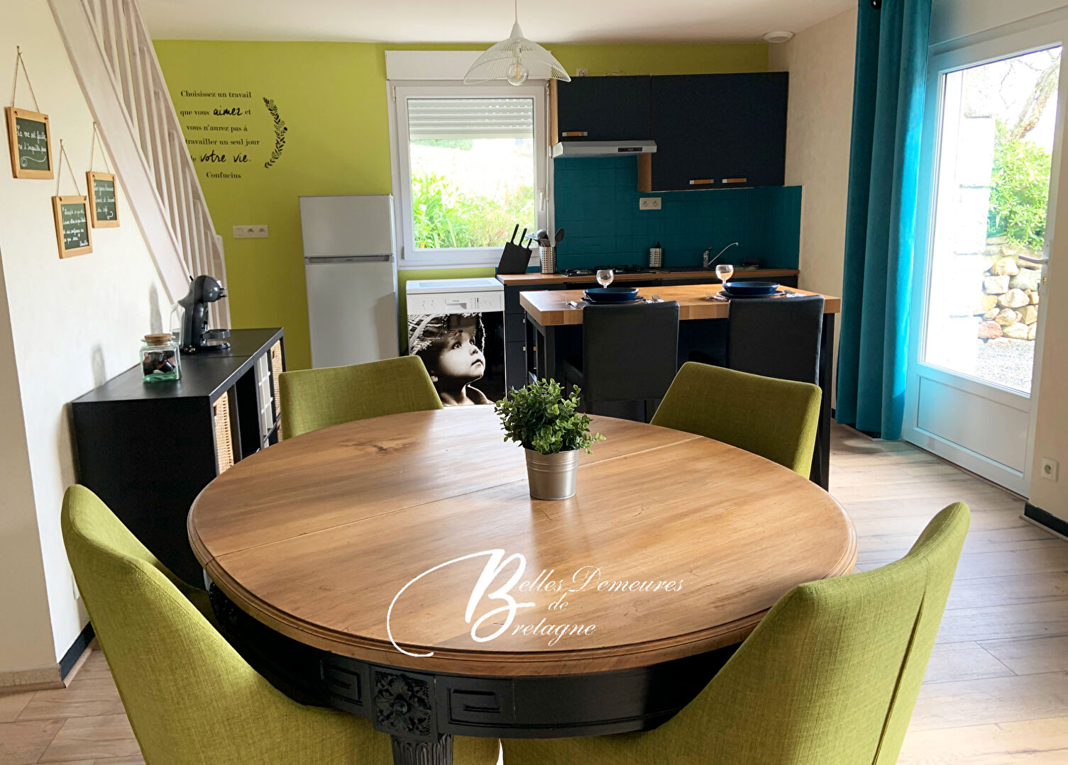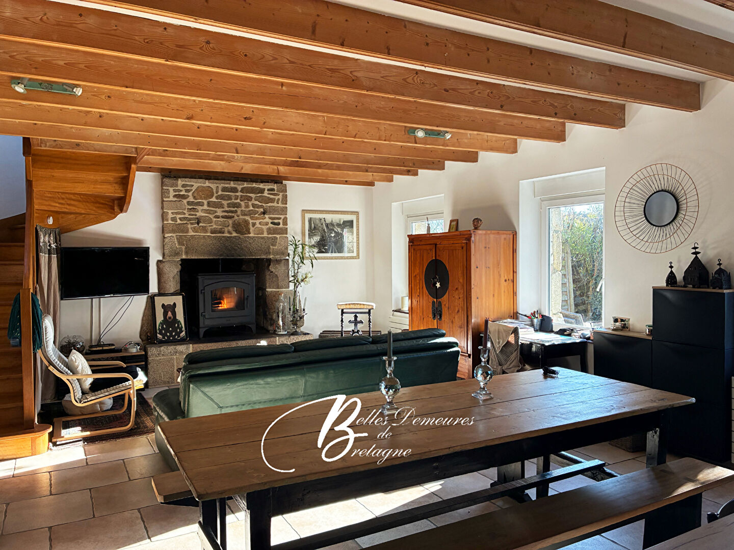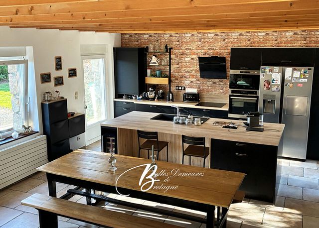 L'ensemble se compose d'une grande maison principale offrant, au rez-de-chaussée, un vaste séjour lumineux équipé d'un poêle à bois, une cuisine moderne avec îlot central et une suite parentale avec bureau, salle d'eau et WC privatifs.