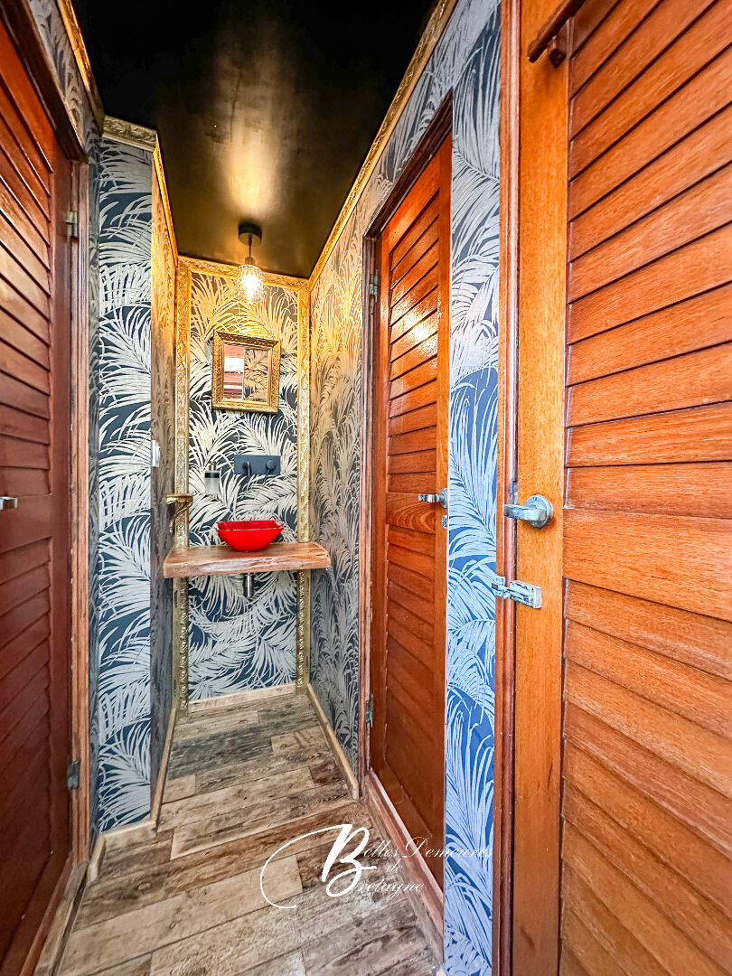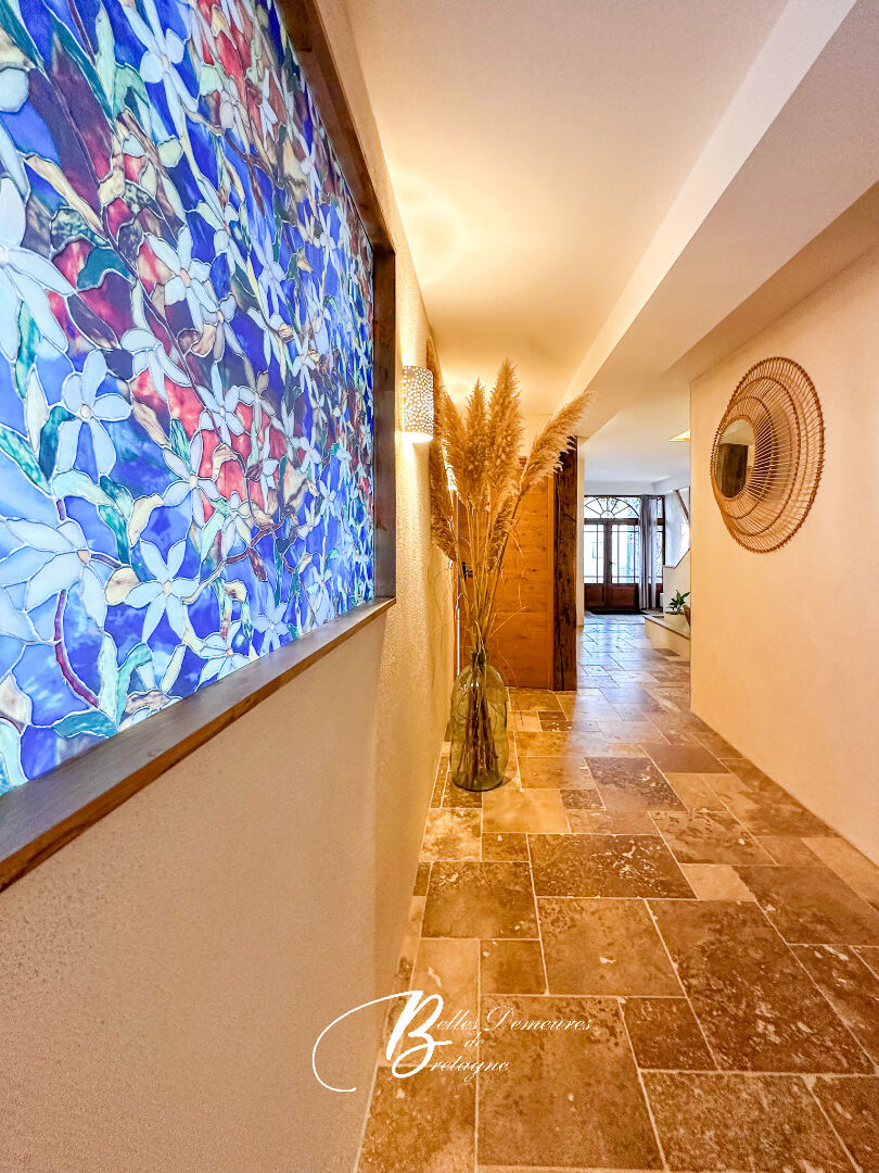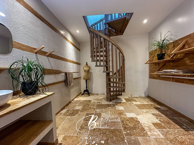 Dès l'entrée le ton est donné par les agencements sur mesure mêlant des éléments anciens de décoration et des matériaux nobles, essences de bois diverses, travertin. L'entrée de taille généreuse distribue deux chambres disposant chacune de sa salle d'eau, des WC, une buanderie, ainsi que la salle d'eau de la troisième chambre située à l'étage. Ces deux pièces communiquent par un escalier en colimaçon. Un autre escalier amène de l'entrée à la pièce de vie toute ouverte où chaque espace est pourtant bien délimité: une cuisine toute équipée et très lumineuse, un espace repas et un salon ouvert sur la place. Des WC également à ce niveau. L'isolation de la toiture par l'extérieur a permis de conserver la charpente apparente dans le séjour, à la manière d'une coque de bateau renversée, rendant cette pièce très chaleureuse.