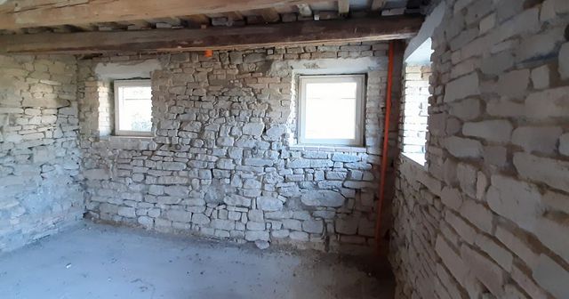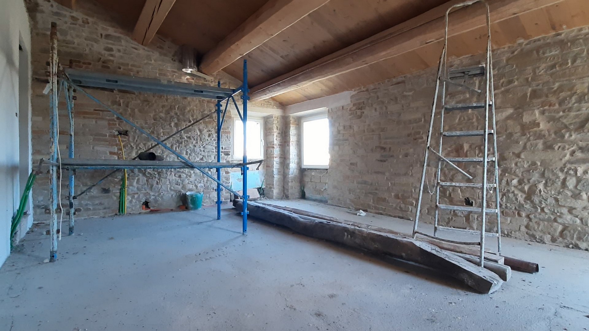 The owner's idea was to develop in this portion of the farmhouse the living area on the ground floor with a beautiful living room, dining room, kitchen and a bathroom and sleeping area on the first floor where you can find another living area with two double bedrooms and a bathroom. But the configuration of the internal arrangements can be changed at will, this portion of the farmhouse can also be connected to the other portion to be restored of 100 square meters on two floors, or you can keep independent the two portions and create another reseidential unit in the portion to be restored. This can also be done with the additional volumes available and with the urban planning characters of the property.