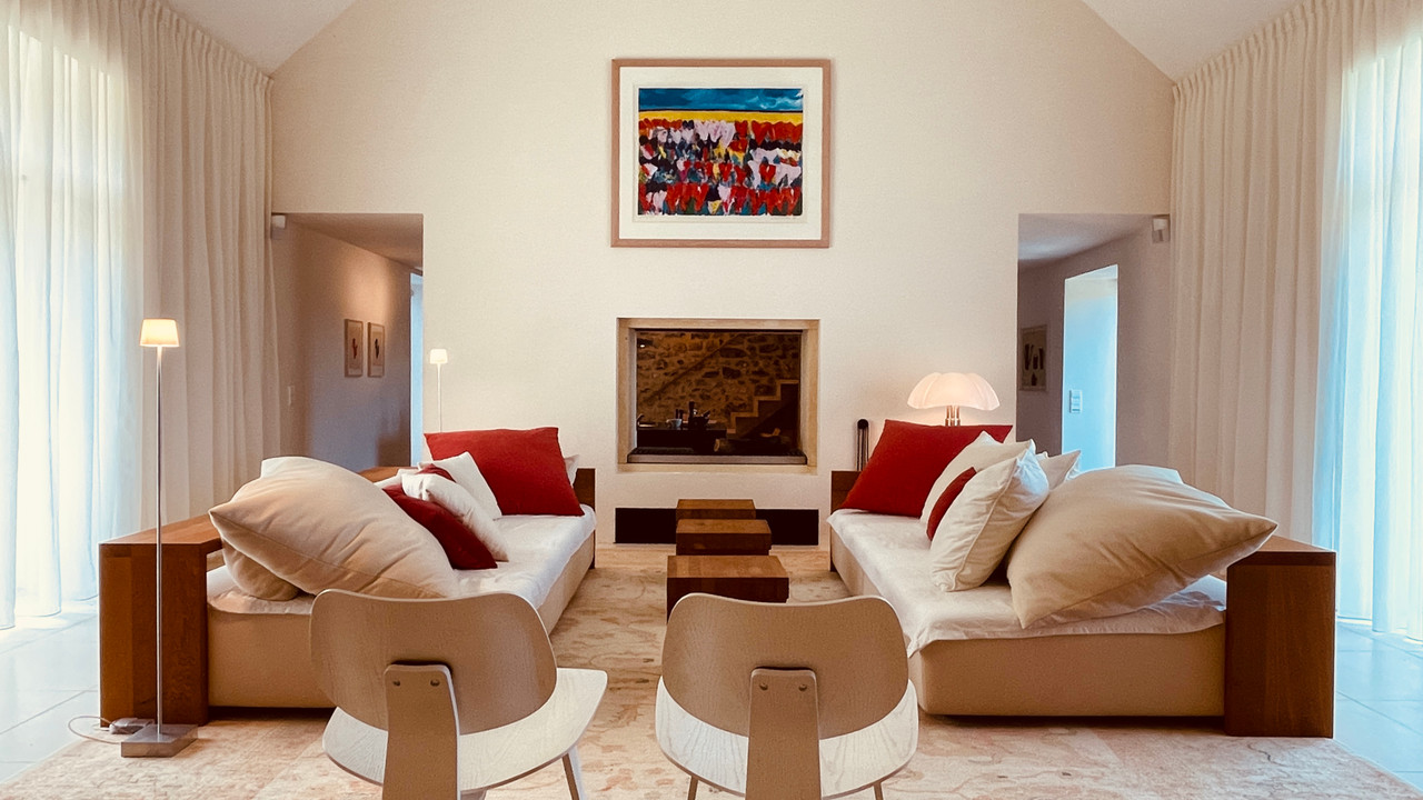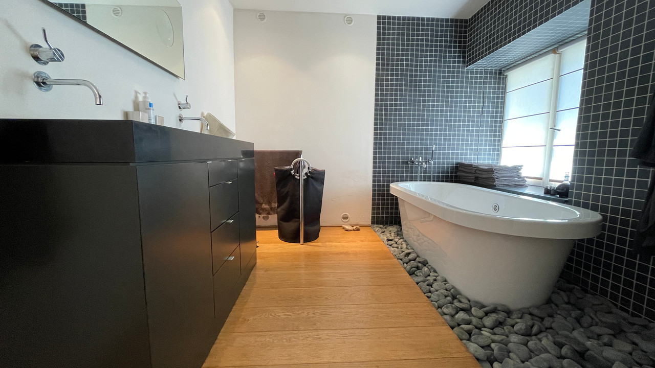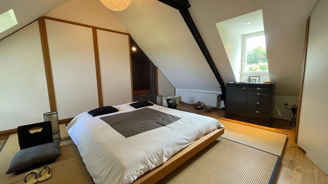 Main house: entrance hall with guest WC, office, living room with fully fitted kitchen separated by a double-sided fireplace, and a large ground-floor en-suite bedroom. Upstairs: three bedrooms (one with Japanese-style shower) and a bathroom.