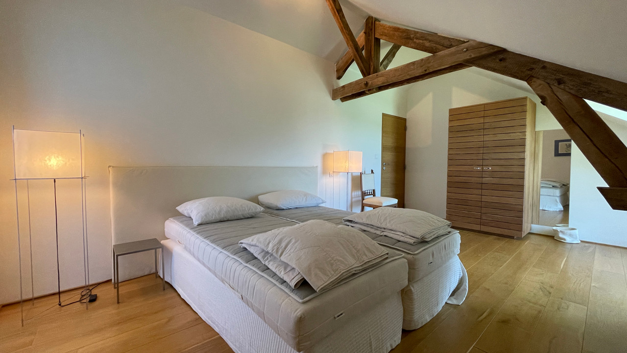 Second house: living/dining room with open-plan kitchen, large bedroom with bathroom, guest WC. Upstairs: two bedrooms and a shower room.