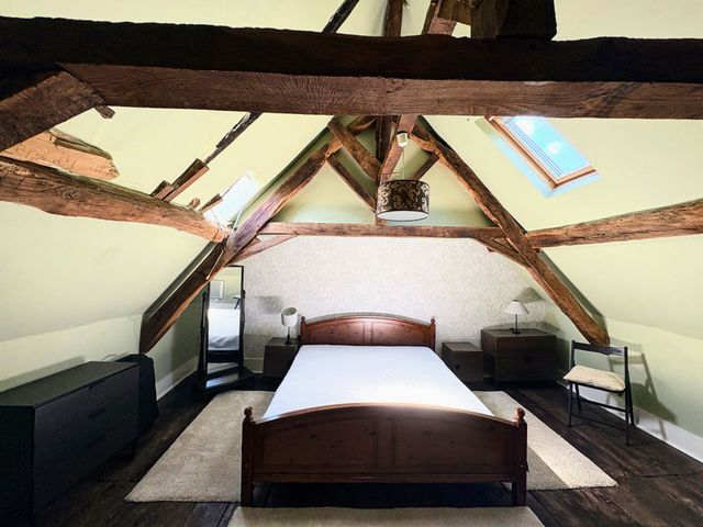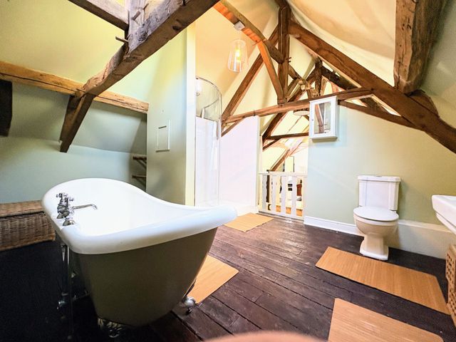 De tweede verdieping, een verbouwde zolderruimte, beschikt over een unieke open slaapkamersuite (38,8 m²), compleet met vrijstaand bad, een royale douche en een toilet – een uitnodigende plek met karakter en privacy.