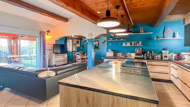 A41498ALK06 - Discover a bright and spacious 169 m² villa set in a peaceful environment in Saint-Cézaire-sur-Siagne. The ground floor offers a large open living/dining room with fireplace, an open fitted kitchen, a utility room, three bedrooms including a superb master suite, two bathrooms and a covered terrace extending the living area outdoors. Upstairs, a mezzanine and an additional room offer ideal space for a home office, home theater or guest accommodation. The property includes a pool, mature garden, garage, carport and ample storage. Surrounded by nature yet close to the village, schools, shops and the Riviera's business hubs, this villa delivers a lifestyle combining comfort, space, fresh air and connectivity. Perfect for families and professionals seeking a new rhythm of life on the Côte d'Azur back-country.