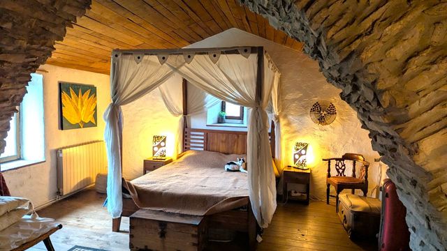 Original features, including vaulted stone arches, high ceilings, and wooden floorboards. The light-filled open-plan kitchen/dining area boasts a handcrafted kitchen, a wood burner, and terracotta tiles that flow throughout the ground floor. A spacious salon with vaulted ceilings, arches, and a log burner, great for entertaining or relaxation.