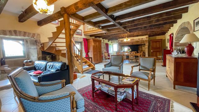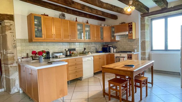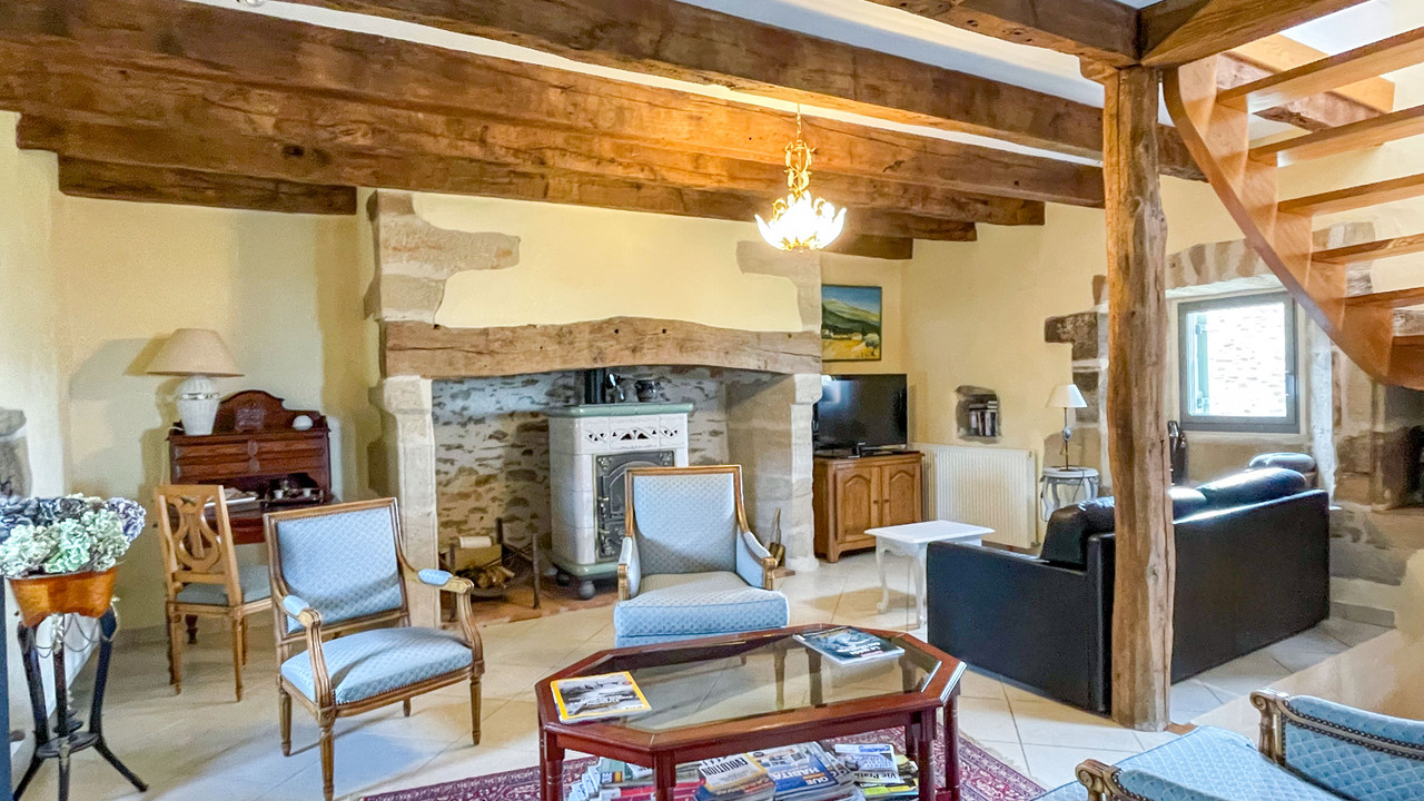 The main house has a large billiard room on the ground floor and an en suite bedroom (independent access); then there's a large open kitchen and a huge 65 m2 living/dining room with two inglenook fireplaces (and Alsatian stove); upstairs, three lovely bedrooms.