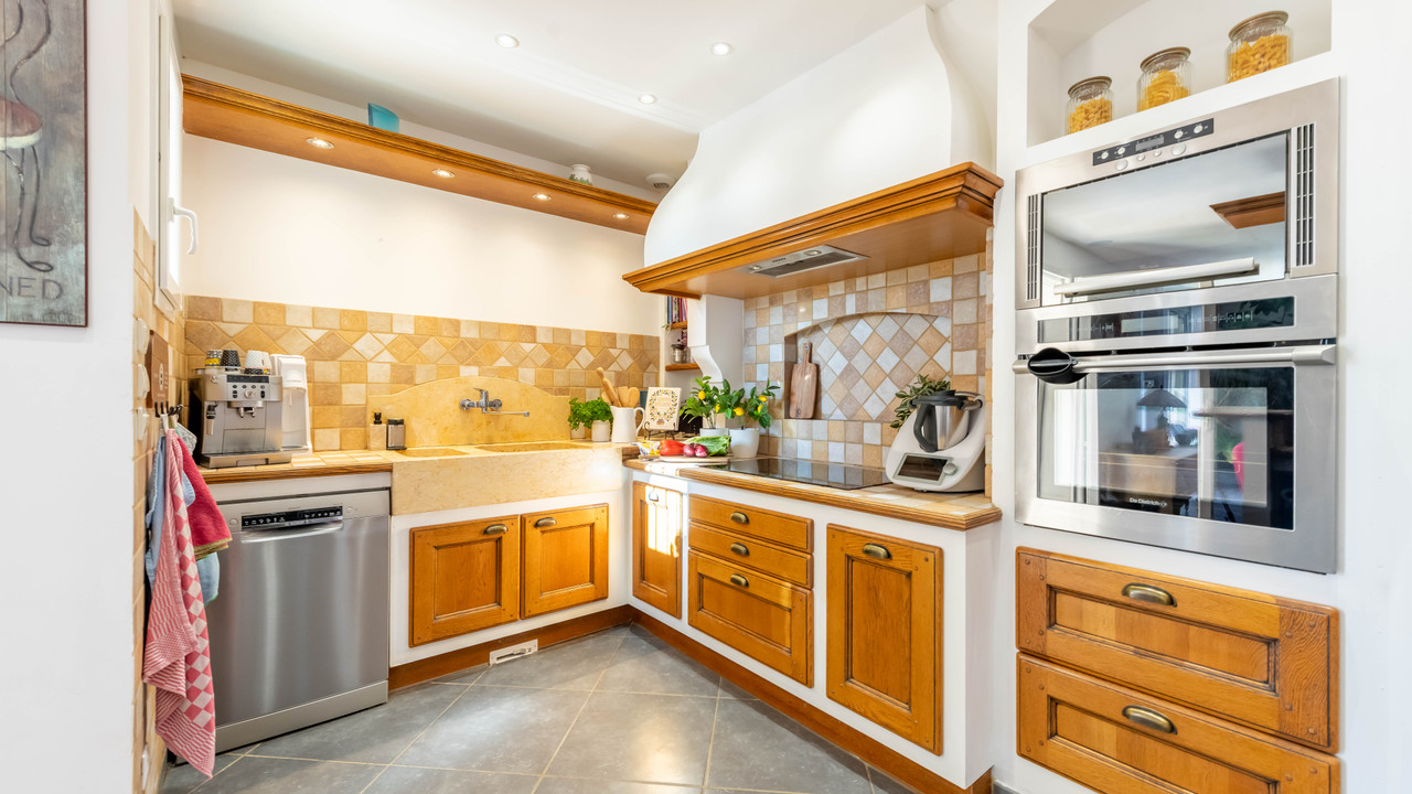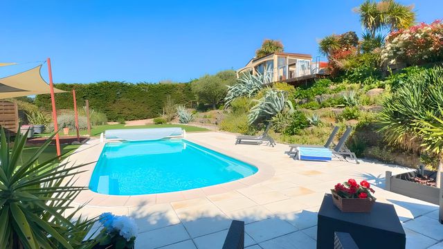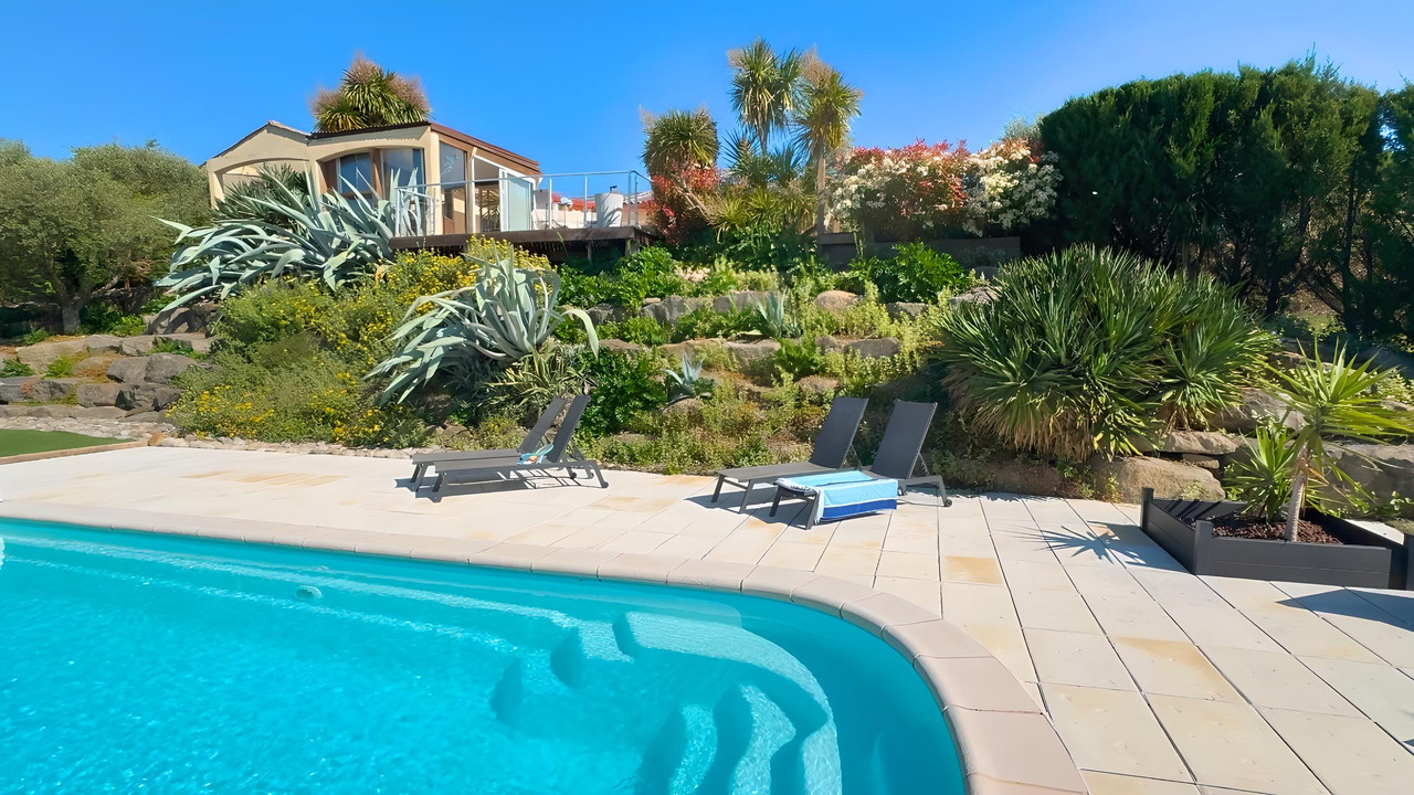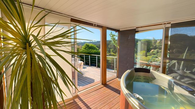 A36618AGU11 - Eco-friendly single-story villa near Lac de la Cavayère in Carcassonne. Built in 2005, offering 180m² of living space on a 2229m² plot with panoramic views of the Alaric Mountains. Bright and spacious living room, elegant open kitchen, three bedroom suites, office/child's bedroom, and a 40m² soundproofed studio with terrace access. A large room of over 30m², currently used as a laundry/gym, could easily be converted into a fourth suite. Expansive terraces, Jacuzzi, landscaped Mediterranean garden, and a 9x4.5m saltwater pool. Additional features include a garden shed, solar panels, reversible air conditioning, central vacuum system, electric car charging station, and alarm system. Strong potential for seasonal rental income. Just 10 minutes from Carcassonne, close to beaches, the lake, and outdoor activities. A peaceful retreat or an excellent investment opportunity in the South of France.