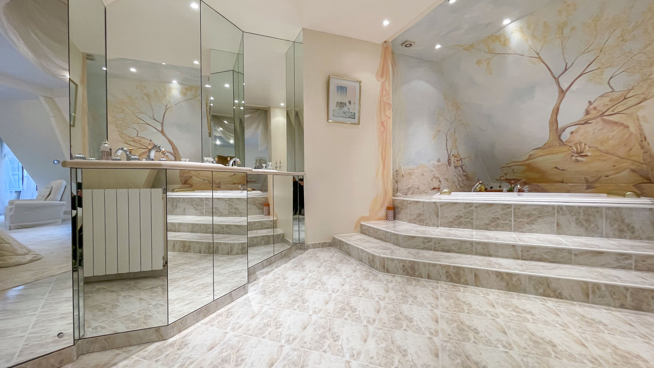 The home features a spacious eat-in kitchen, cozy lounge with cantou fireplace, and a 78 m² living-dining room with dramatic volumes. Upstairs, four large bedrooms, including a luxurious 60 m² master suite, are complemented by two attic rooms ideal for guests or a home office. Central underfloor heating on the ground floor ensures year-round comfort.