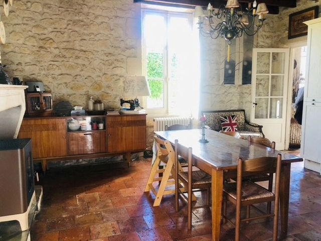- A spacious entrance hall opening onto a country-style kitchen with a fireplace for a warm and inviting atmosphere.
