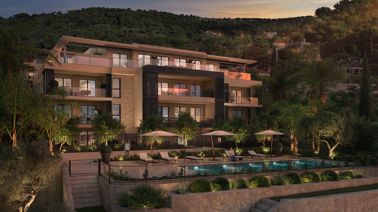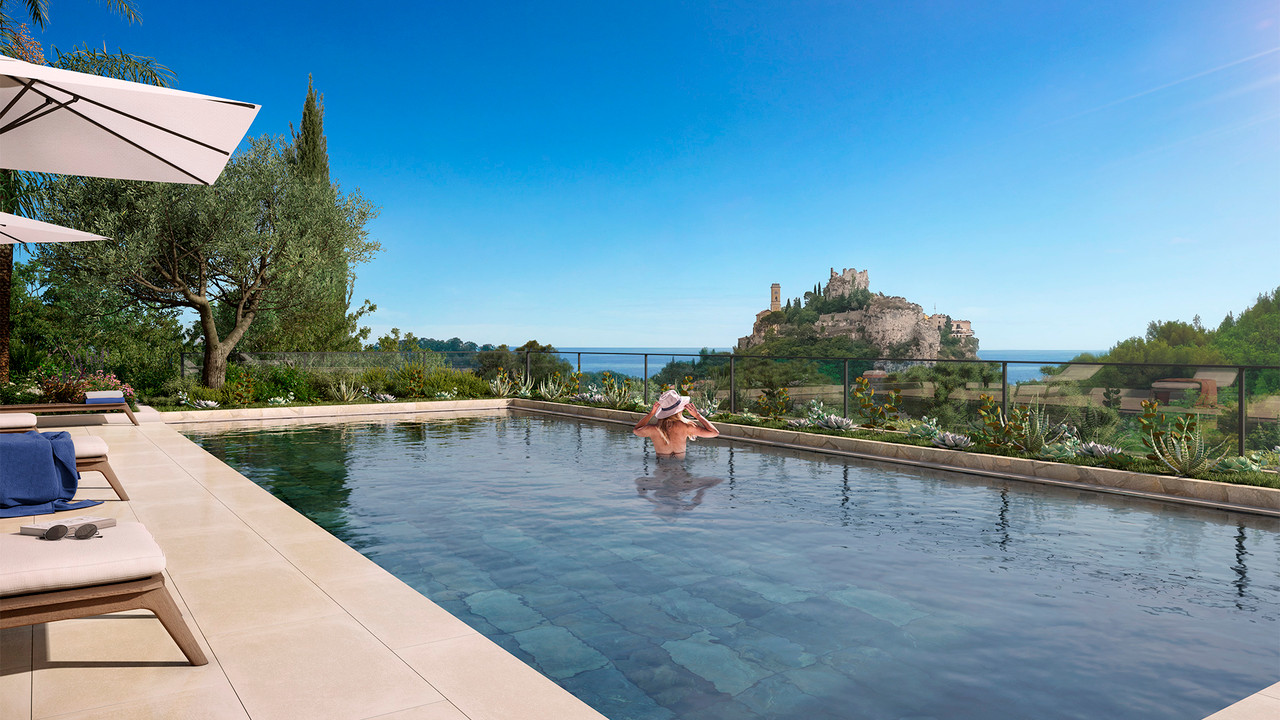 A25844OVI06 - Eze - New build. On the heights between Nice and Monaco, in an enchanting natural site, we are offering an exceptional development with a swimming pool. Mostly south-facing, the 22 apartments, from 2 to 5 rooms, have spectacular sea views. Spread over 2 buildings, they all have an outdoor space, private garden or terrace. A terraced landscaped garden follows the steep relief of the landscape.