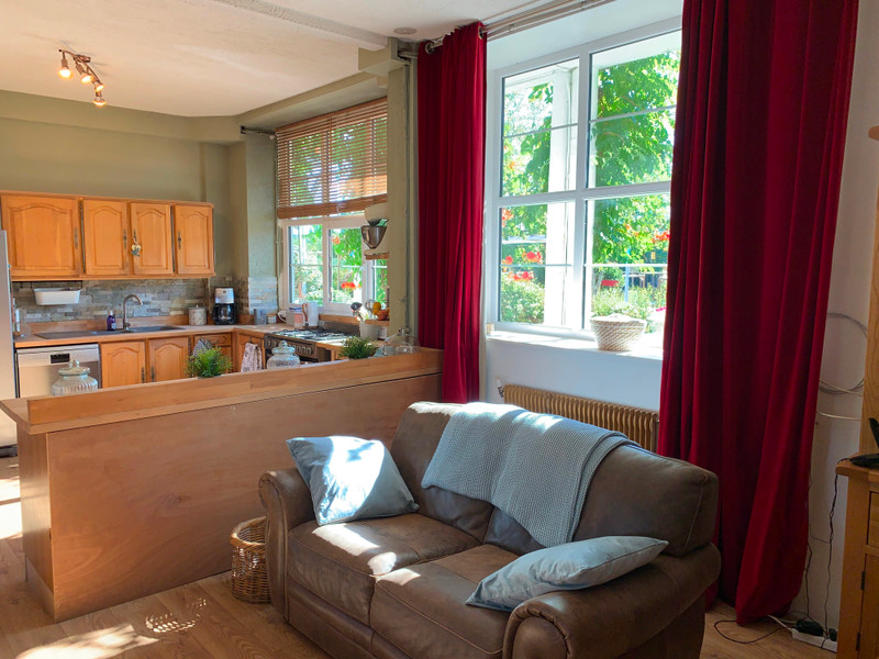 Open keuken/woonkamer/eetkamer (51,3 m²) met natuurstenen muren, een houtkachel en een volledig uitgeruste keuken met een fornuis, koelkast en vaatwasser. Openslaande deuren leiden naar een privéterras en een kleine ommuurde tuin.