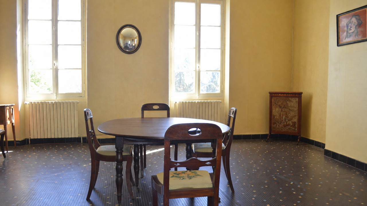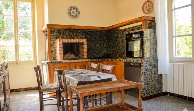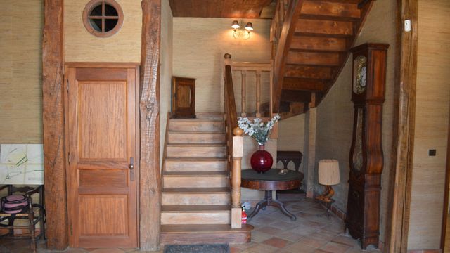 Exposed stonework and century-old beams define the soul of this place. The ground floor opens onto a majestic porch, a spacious living room with an open fireplace, a study and utility rooms. The first floor, accessible at ground level, offers a second entrance, a kitchen, a small lounge, a dining room and three bedrooms.