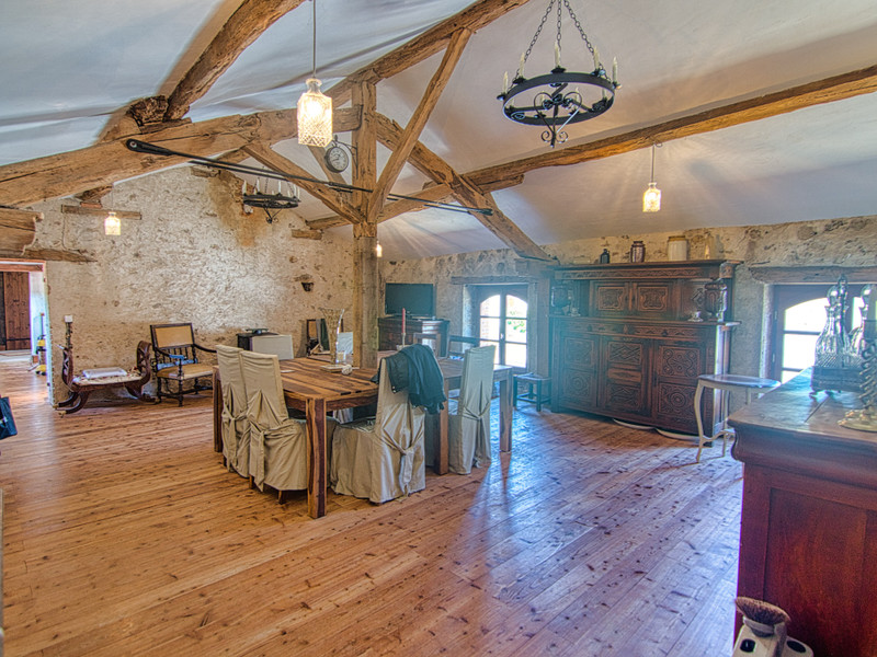Nadat de culinaire creaties zijn voltooid, kunt u zich verzamelen in de ruime eetkamer (45 m²). Zichtbare stenen muren en massieve eikenhouten balken creëren een gevoel van rustieke elegantie, terwijl op maat gemaakte sfeerverlichting de perfecte ambiance creëert. Er is een gunstig gelegen gastentoilet op deze verdieping.