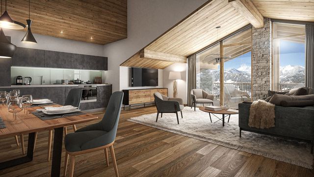 A22189NAS73 - This stunning new build development is situated in the very heart of the beautiful ski resort of Notre Dame de Bellecombe. This luxury apartment comes fully furnished and finished to the highest standars. It features a master suite, a second bedroom and a bunk room as well as a large, open plan living and dining area which opens out onto a terrace, offering incredible views over the village and surrounding mountains.