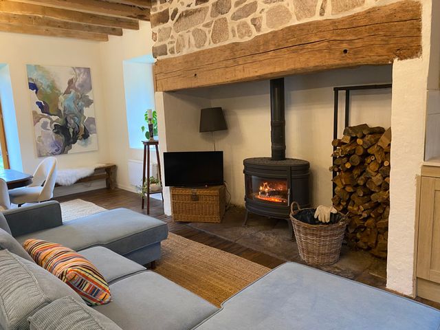 Het huis bestaat uit een eigen ingang naar de woonkamer met open keuken en traditionele "cantou", een open haard waarin een houtkachel is geïnstalleerd. Een toilet completeert deze verdieping.