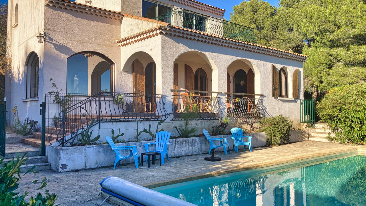 A41062RAB34 - Set above the charming fishing village of Bouzigues, renowned for its seafood, oyster farms, and waterfront restaurants, this spacious property offers outstanding views over the coastline, the Étang de Thau, and the village below. With only a few neighbouring homes, the house sits on a large enclosed garden shaded by mature pine trees and benefits from a swimming pool, double garage, carport, and ample parking.