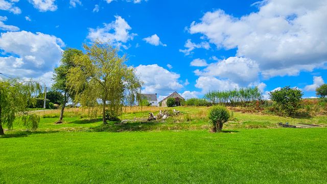 Set in a large garden with field below bordered by a stream, and with views over the valley beyond, situatued in a quiet hamlet, yet within easy reach of Baud (10 minutes), Locminé (8 minutes), Vannes (30 minutes), Lorient (35 minutes) and Auray (30 minutes).