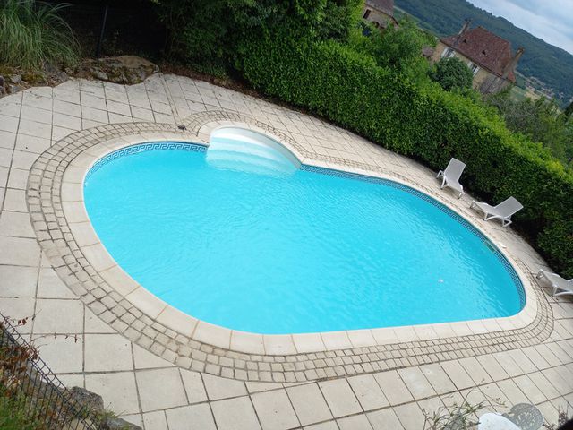 Buiten beschikt de woning over een verwarmd ovaal zwembad van 10 x 5 meter, perfect gelegen om te genieten van een ononderbroken, spectaculair uitzicht op de Dordogne.