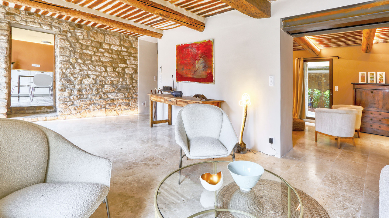 A35681EKO84 - In the lovely Provençal village of Rustrel, this former head office of ochre traders from the 19th century combines charm, modern design and comfort. Completely renovated in 2024 with great taste, it offers spacious interiors, high-quality materials and a great energy rating (C).