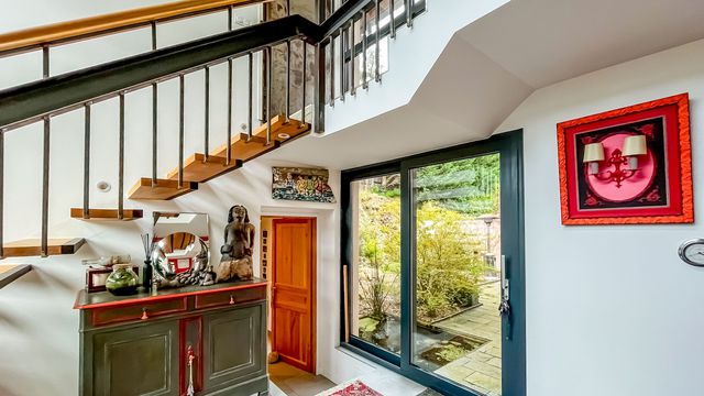 The 4-bedroom home, including two en-suite bedrooms, is filled with natural light, featuring high ceilings, cosy corners, and versatile spaces perfect for family living, entertaining, or remote working. Highlights include a spacious living room with fireplace, modern kitchen, mezzanine, underfloor heating, solar panels, and wine cellar.