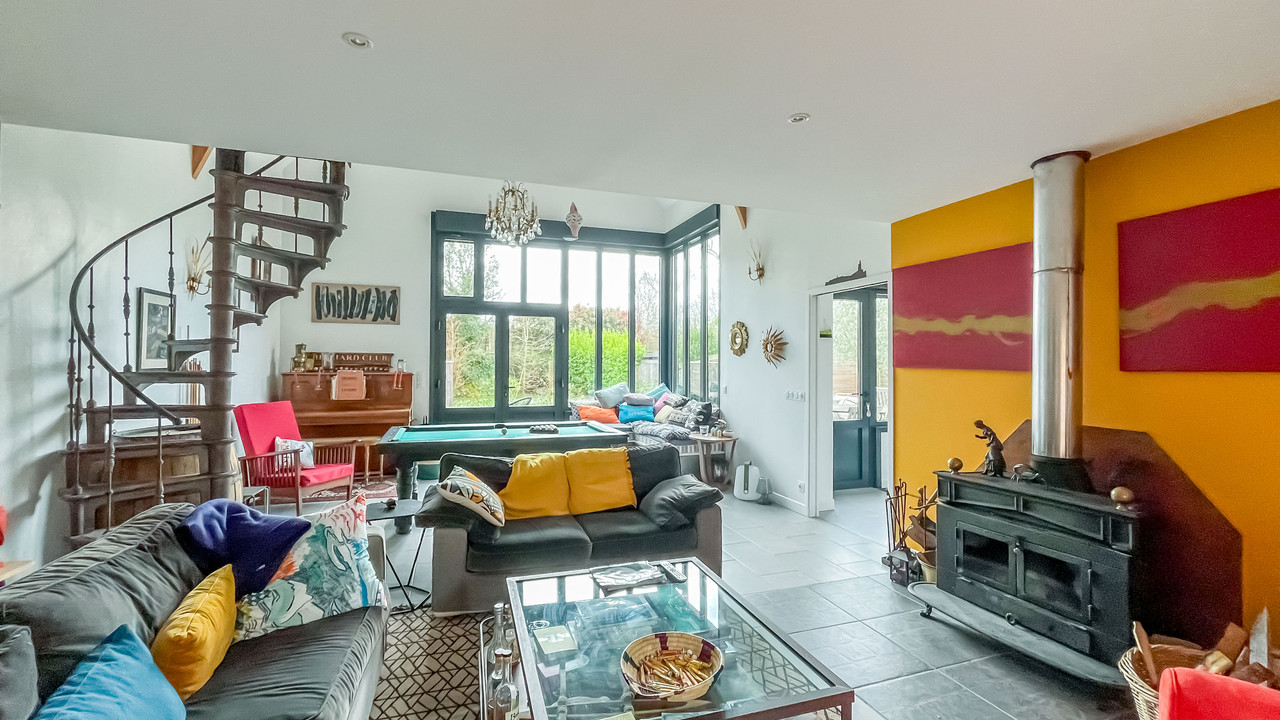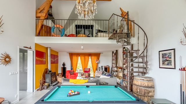 The 4-bedroom home, including two en-suite bedrooms, is filled with natural light, featuring high ceilings, cosy corners, and versatile spaces perfect for family living, entertaining, or remote working. Highlights include a spacious living room with fireplace, modern kitchen, mezzanine, underfloor heating, solar panels, and wine cellar.