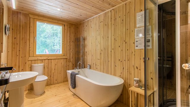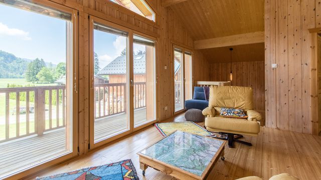 At the front, an expansive garden overlooks open fields, while the rear of the chalet backs onto the forest.
