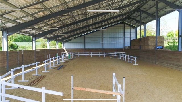 The equestrian facilities include an outdoor dressage area, an undercover riding arena housed in an outbuilding with solar panels that generate a yearly revenue for the owners, 3 other buildings (housing a total of 11 stables, an indoor horse walker, tack room and storage areas) and a total of just under 4 hectares of paddocks and meadows that belong to the property (with the possible opportunity to lease a further 16 hectares of land.)