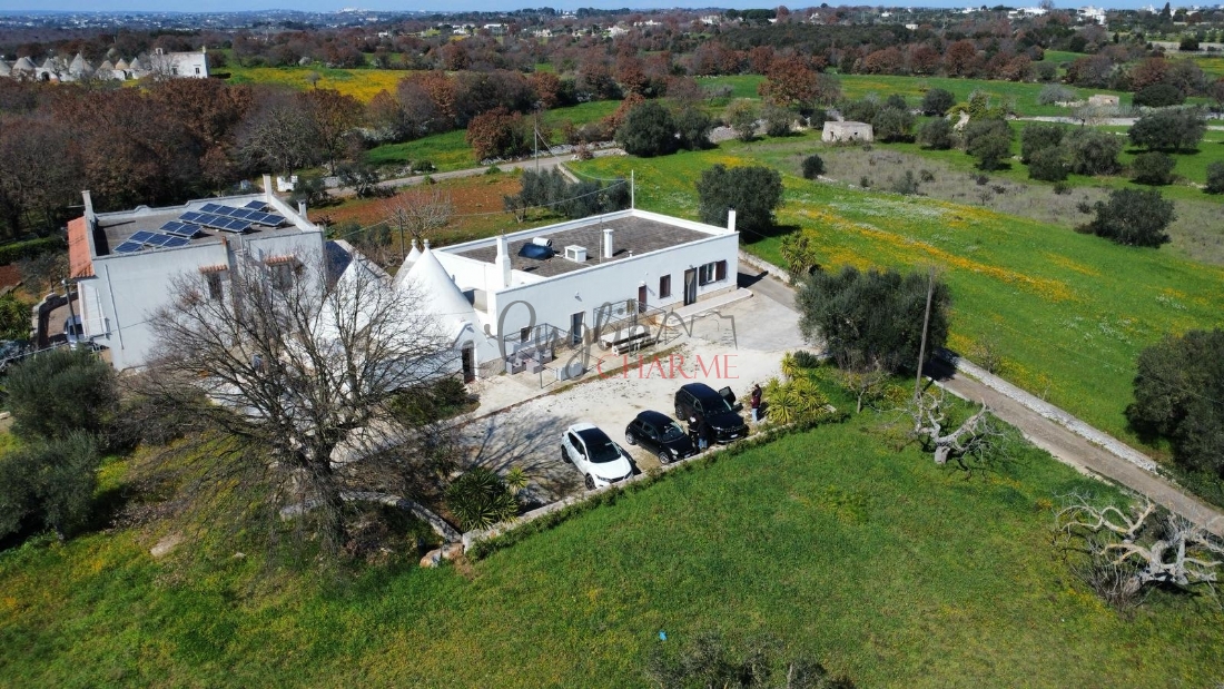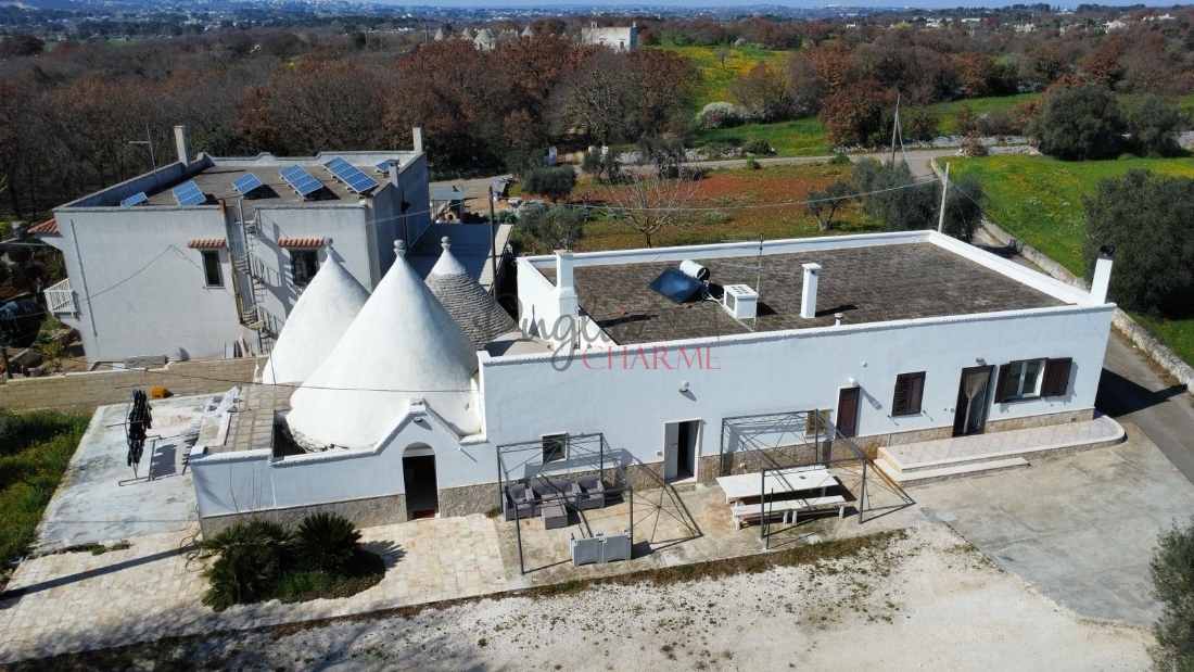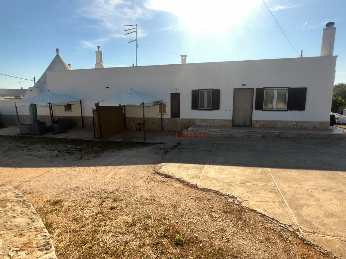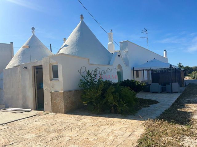 Te koop op het platteland van Ostuni, een gerenoveerde trullo in uitstekende staat, met bijgebouw, gelegen op een perceel van ongeveer 5.000 m2, omgeven door karakteristieke droge stenen muren.
