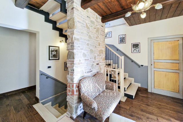 € 615.000 ID: 175805Typical three storey brickwork restored Marche farmhouse of about 325 sqm, with very large portico (porch) of about 60 sqm, detached outbuilding to be rebuilt of about 90 sqm, cellar of about 10 sqm, on a fenced garden of about 2.500 sqm, with extraordinary view of the Sibillini Mountains, the surrounding hills and medieval cities!The ground floor of this typical Marche farmhouse of about 120 sqm is divided into a wide living room with fireplace with dining area, a kitchen, a laundry - utility room, a study and a bathroom. The living room leads to the stunning 60 square meter portico (porch) with antique terracotta tile flooring. From here, you can access the garden, adorned with beautiful mature trees. From the portico and garden, you can enjoy the spectacular view of the Sibillini Mountains.