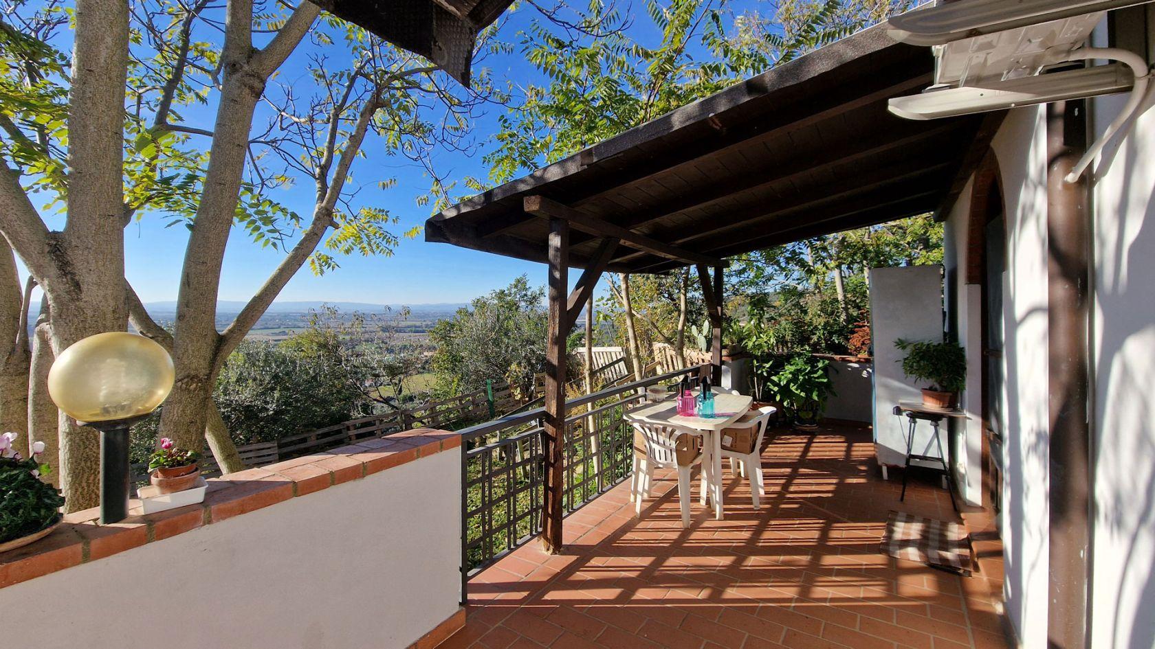 Buiten omarmt een grote loggia de voorkant van het huis, met schaduwrijke ruimtes die ideaal zijn om te ontspannen, terwijl aan de achterkant panoramische terrassen een buitengewoon uitzicht bieden dat zich uitstrekt van Valdichiana tot het Trasimenomeer.