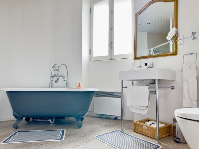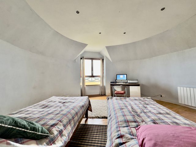 Op de eerste verdieping bevindt zich een ruime slaapkamer met toegang tot twee terrassen, waarvan één uitkijkt op de baai van Mont-Saint-Michel en de andere op de privétuin en het landschap.